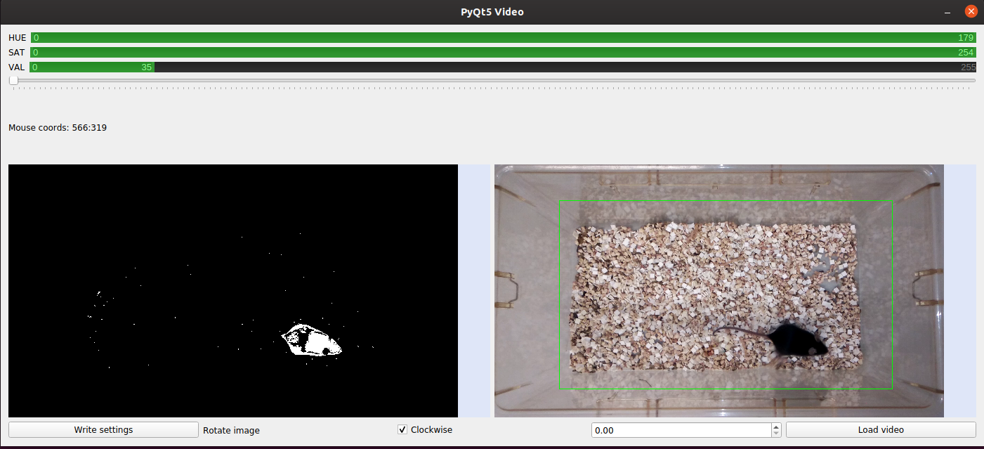 In the previous version, the results from the threshold script needed to be entered manually as commandline arguments into the analysis script. Now it is much simpler: In the threshold GUI module (Fig 1), the thresholds can be adjusted and written to a file. The animapp analysis module then reads these settings when loading the video(s) of interest. There is also a rotation option now, so that if the videos to be analysed are ’tilted’, but also need to be cropped, these settings can be noted in the threshold module.